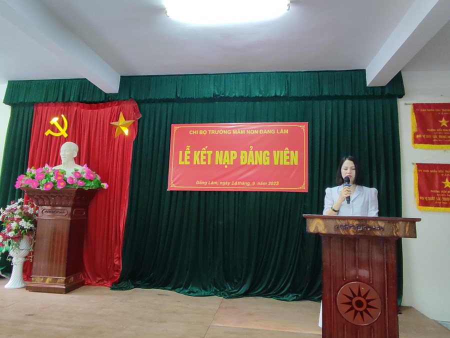 Sau khi nhận Quyết định, trước cờ Tổ quốc, Đảng kỳ và chân dung Chủ tịch Hồ Chí Minh, đồng chí Đảng viên mới tuyên thệ tuyệt đối trung thành với lý tưởng cách mạng, chấp hành nghiêm chỉnh Điều lệ Đảng, thực hiện đúng Nghị quyết, Chỉ thị của Đảng, chính sách, pháp luật của Nhà nước; không ngừng học tập nâng cao trình độ chuyên môn nghiệp vụ; tích cực tham gia công tác quần chúng, công tác xã hội, liên hệ chặt chẽ với nhân dân;… Đồng chí Phạm Thị Tươi cũng gửi lời trân trọng cảm ơn Đảng ủy phường Đằng Lâm, Chi bộ trường Mầm non Đằng Lâm đã bồi dưỡng, giúp đỡ để đồng chí có cơ hội được đứng trong hàng ngũ của Đảng; đồng thời xin hứa sẽ luôn phấn đấu và hoàn thành tốt nhiệm vụ được giao để xứng đảng với sự tin tưởng của chi bộ.
