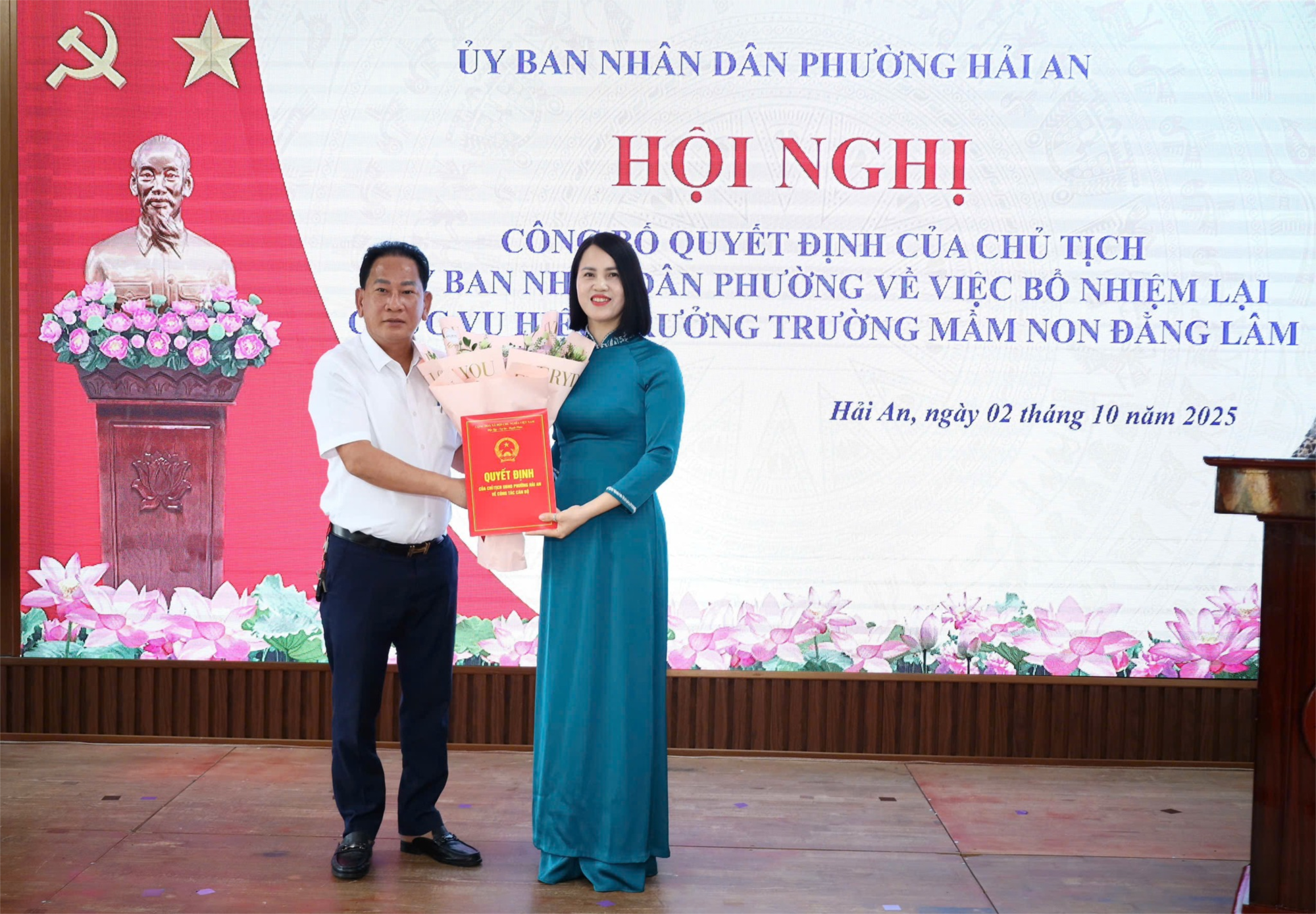 Ngày 02 tháng 10 năm 2025, tại Trường Mầm non Đằng Lâm, UBND phường Hải An đã long trọng công bố Quyết định bổ nhiệm lại chức vụ Hiệu trưởng Trường Mầm non Đằng Lâm đối với đồng chí Đỗ Thị Thảo Nguyên.