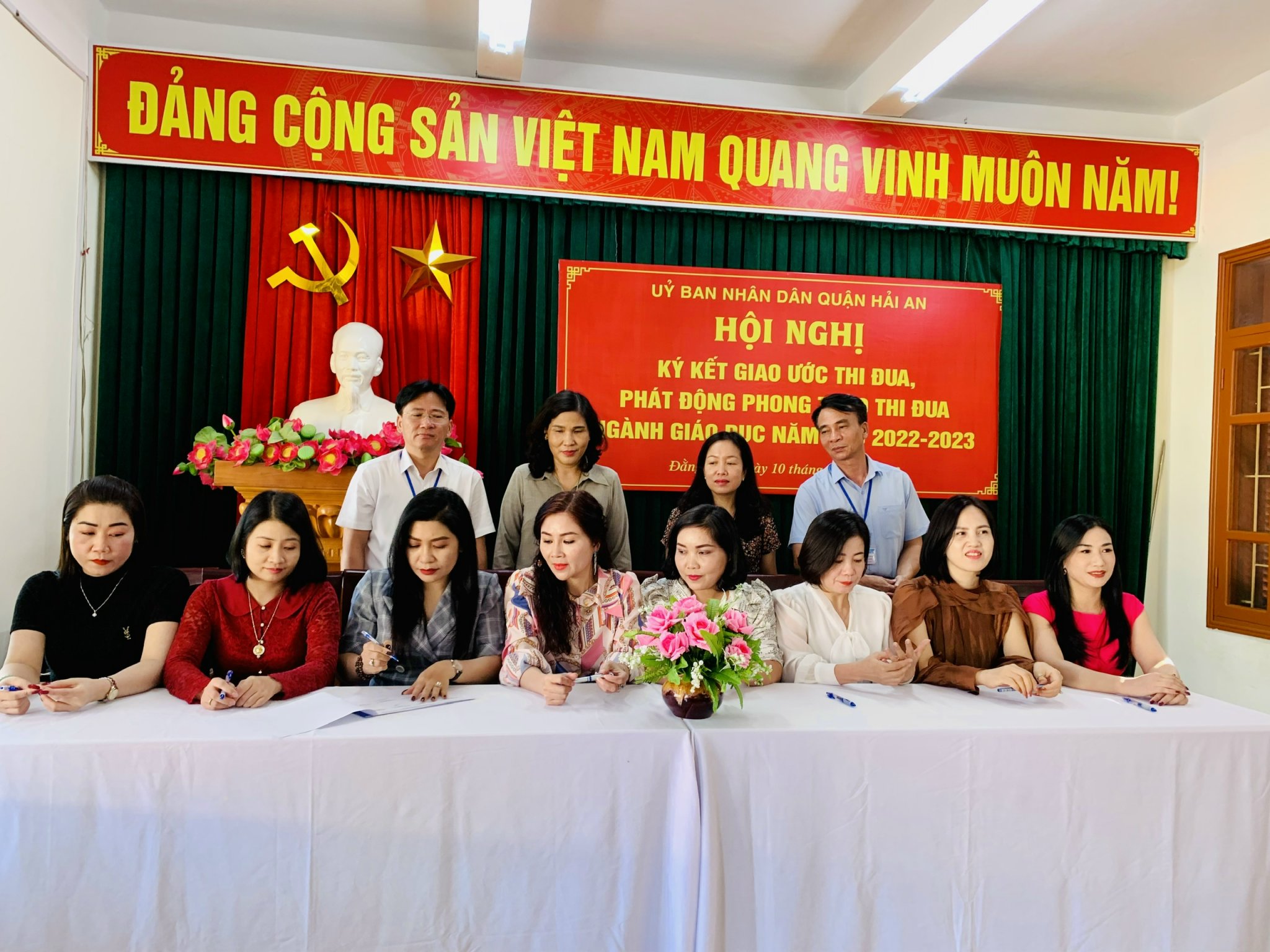 Ngày 10/10/2022 Khối thi đua ngành giáo dục quận Hải An tổ chức hội nghị ký kết giao ước thi đua, phát động thi đua ngành Giáo dục năm học 2022-2023. Về dự hội nghị có đồng chí Trần Thị Kim Oanh- PCT UBND Quận; đồng chí Phạm Văn Toàn- Trưởng phòng Nội vụ quận, đồng chí Nguyễn Thị Minh Thu- Trưởng PGD&ĐT Quận,, đồng chí Phạm Phú Thuấn - Phó trưởng PGD & Đt Quận cùng các đồng chí Chuyên