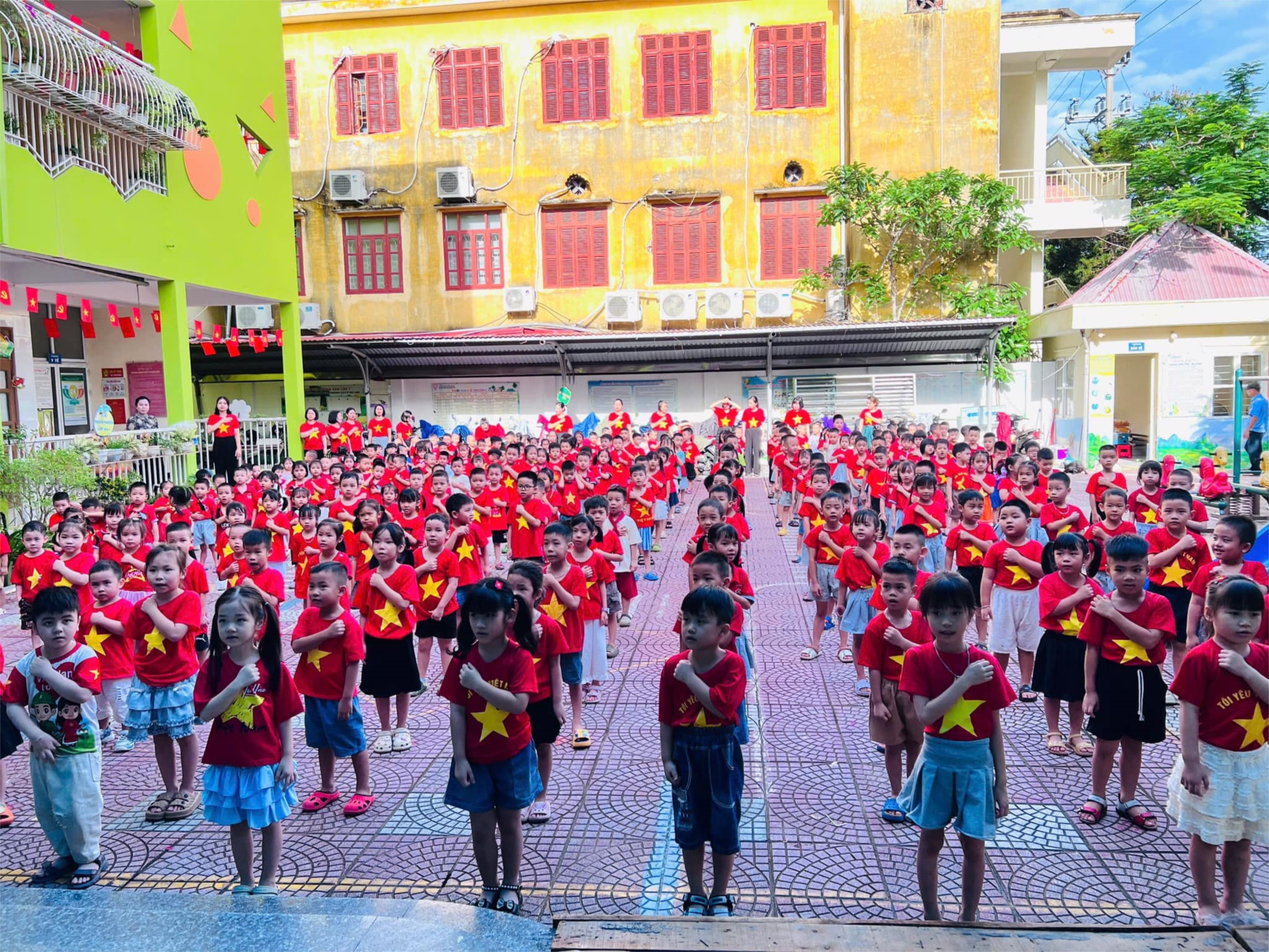 Ngay từ những ngày cuối tháng Tám, khắp sân trường đã rực rỡ cờ hoa, khẩu hiệu, băng rôn chào mừng. Các bé cùng cô giáo hào hứng tập luyện những tiết mục văn nghệ ca ngợi Đảng, Bác Hồ, ca ngợi quê hương, đất nước. Những giai điệu trong trẻo từ bài hát "Ai yêu Bác Hồ Chí Minh hơn thiếu niên nhi đồng”hay "Những trái tim Việt Nam” “Quốc ca Việt Nam.”....vang lên trong giọng hát ngây thơ của các em nhỏ khiên không khí thêm trang trọng, xúc động.