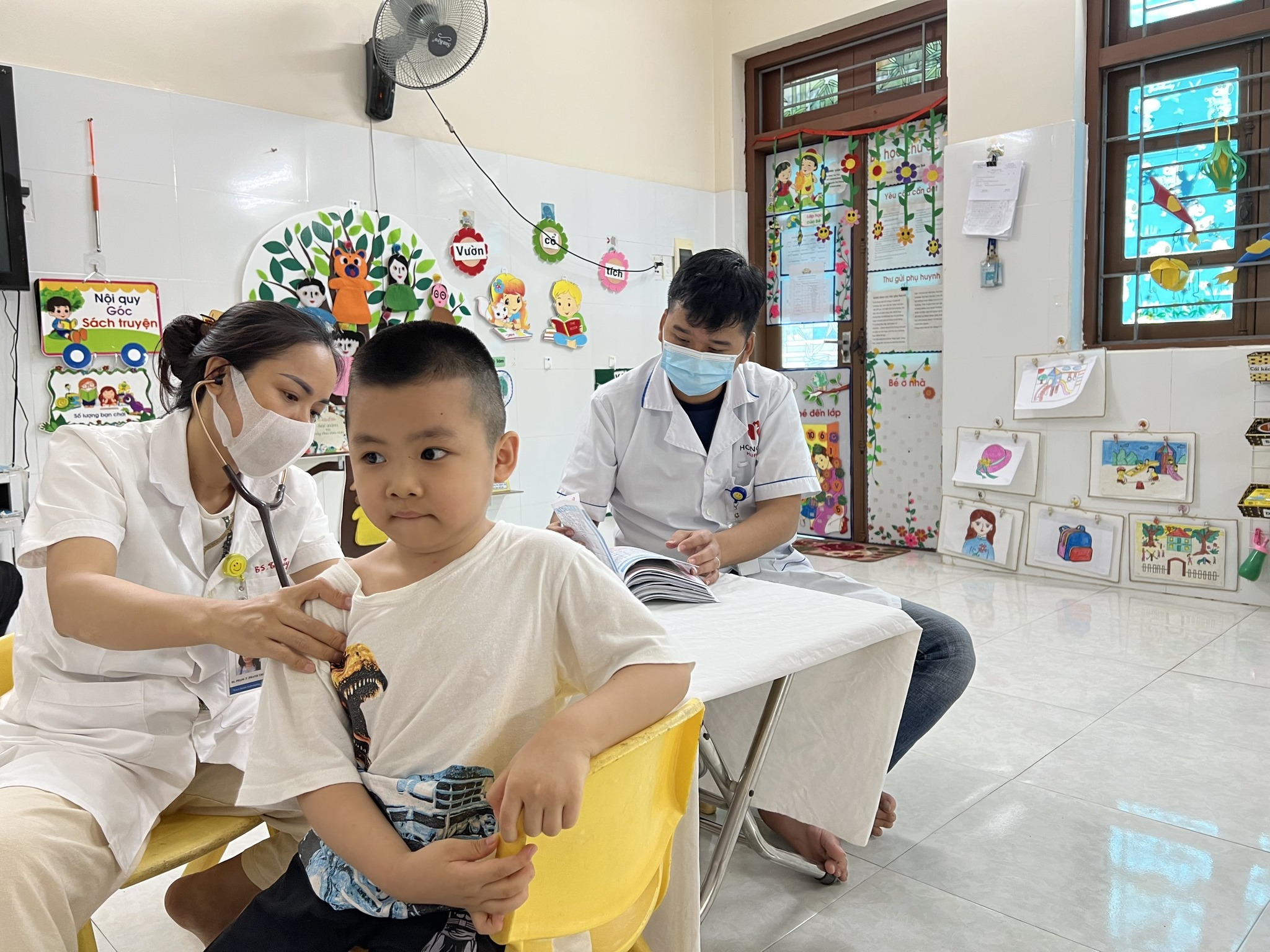 Các nội dung các con được khám đó là: đo chiều cao, cân cặng, đo thị lực, huyết áp, khám răng, hệ hô hập, tim mạch, cột sống… 100% trẻ được cân đo, tra kênh và khám sức khỏe (Trong đó: 89% trẻ có sức khỏe loạn A, B; 12% trẻ có sức khỏe loại C). Kết quả cân đo được cập nhật ngay vào cơ sở dữ liệu ngành, báo cáo về Phòng GD&ĐT quận và thông báo tới phụ huynh học sinh.