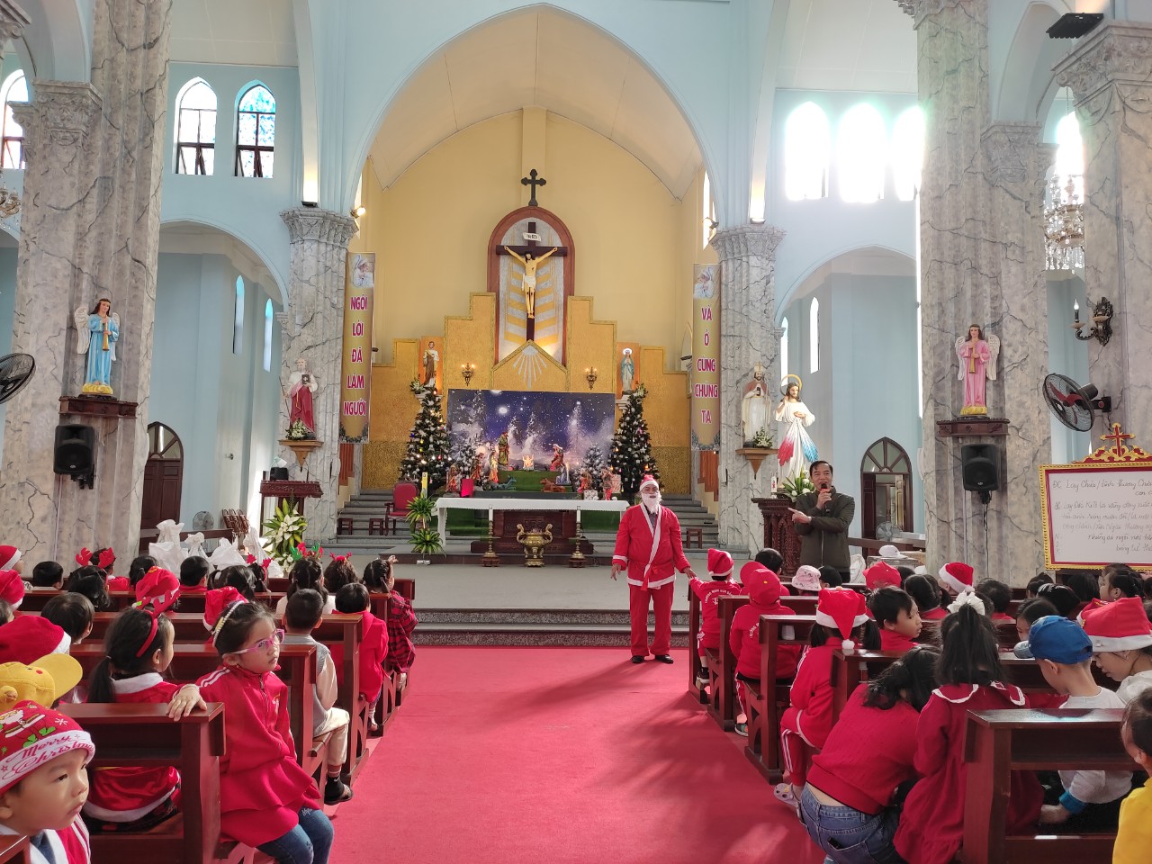 Đến nhà thờ các bé được trò chuyện cùng với cha sứ và được ông già Noel tặng quà. Bé nào cũng vui tươi, phấn khởi